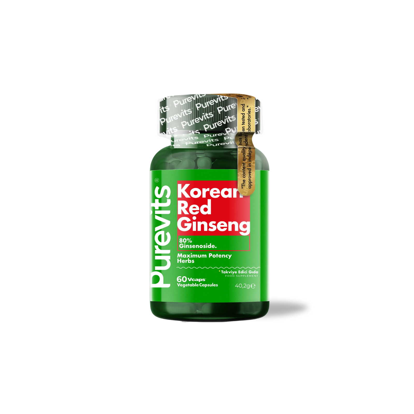 Purevits Korean Red Ginseng (Panax ginseng) ekstresi içeren besin takviyesidir.